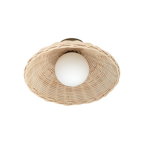 This Wall light can be used as a wall sconce or as a flush mount ceiling light. The round shade is made of natural materials (rattan and wood).Inside the rattan shade is installed a white matte glass globe. Metal fasteners hold the glass globe on the rattan shade.This innovative design combination will make your space no longer monotonous.